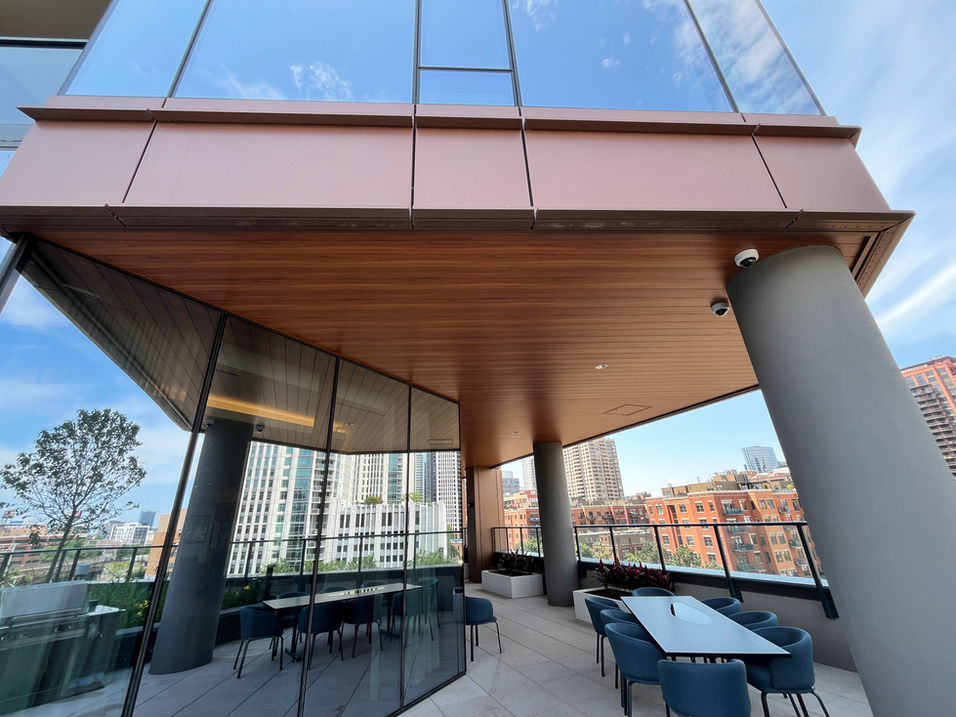 ACM panels in a custom West Hazelnut Mica-Longboard 6" V-groove extruded aluminum soffit panels in a Light Cherry finish